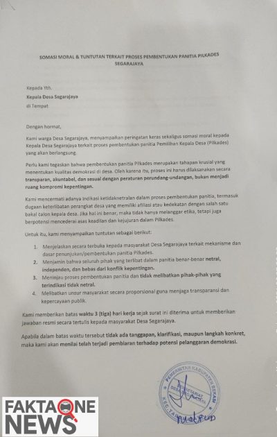 Proses pembentukan panitia Pemilihan Kepala Desa (Pilkades) Segarajaya kini menjadi perhatian publik. Sorotan muncul seiring adanya surat resmi yang dilayangkan tokoh pemuda, Bagus Dwi Roosandhi, kepada Kepala Desa dan Ketua Badan Permusyawaratan Desa (BPD) Segarajaya.